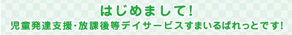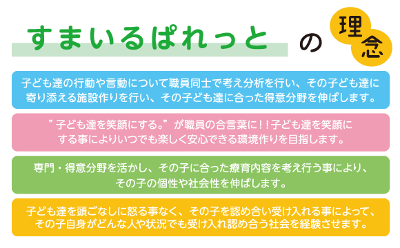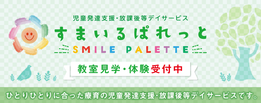 | 事業所名 | 児童発達支援・放課後等デイサービスすまいるぱれっと |