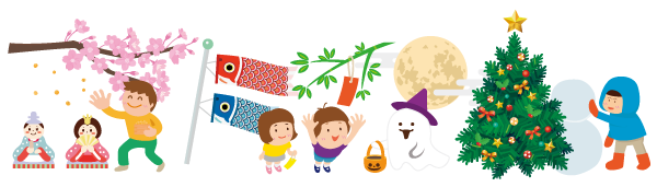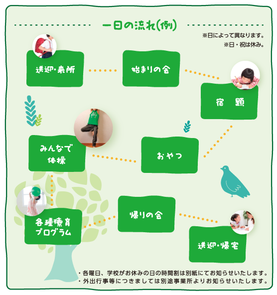 1日の流れ※日によって異なります。 まずはお気軽にご相談ください。 季節の行事 みんなで一緒に楽しめる、さまざまな年間行事を計画しています! ※各曜日、学校がお休みの日の時間割は別紙にてお知らせいたします。 ※外出行事等につきましては別途事業所よりお知らせいたします。
